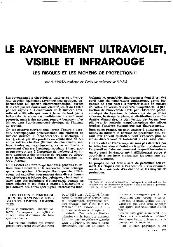Le Rayonnement ultraviolet, visible et infrarouge : les risques et les moyens de protection