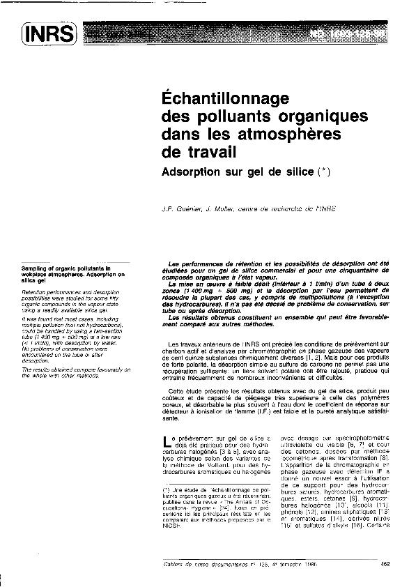 Échantillonnage des polluants organiques dans les atmosphères de travail : adsorption sur gel de...