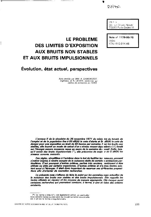 Le Problème des limites d'exposition aux bruits non stables et aux bruits impulsionnels :...