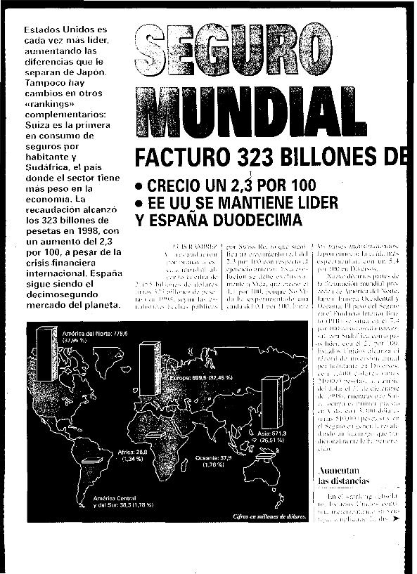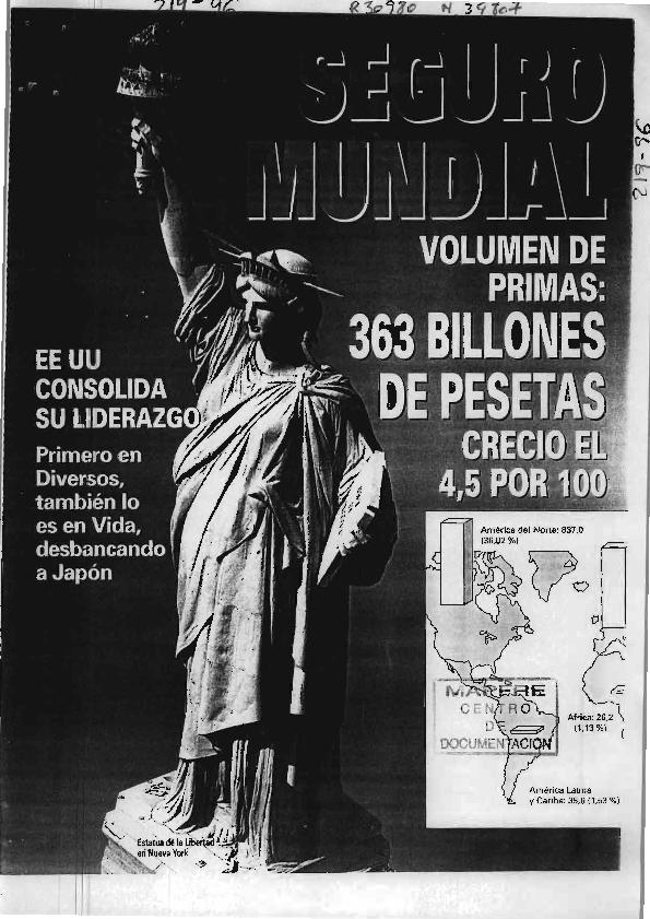 Seguro mundial : volumen de primas: 363 billones de pesetas: creció el 4,5 por 100