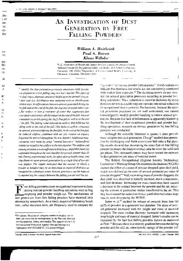 An Investigation of dust generation by free falling powders