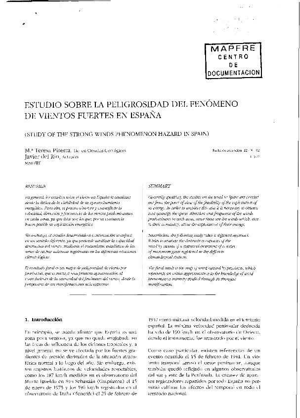 Estudio sobre la peligrosidad del fenómeno de vientos fuertes en España = (Study of the strong...