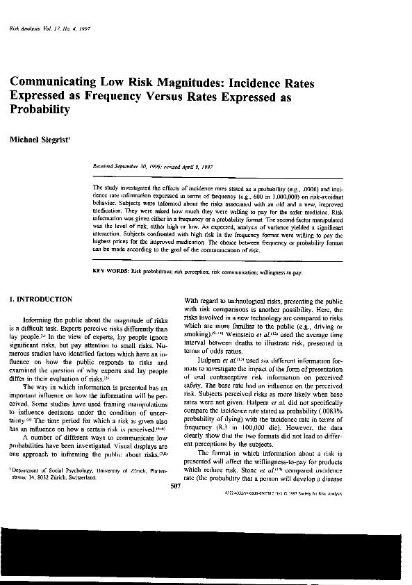 - En: Risk analysis : an international journal. - McLean, Virginia : Society for Risk Analysis, 1987-2015 = ISSN 0272-4332. - 01/06/2008 Tomo 28 Número 3 - 2008