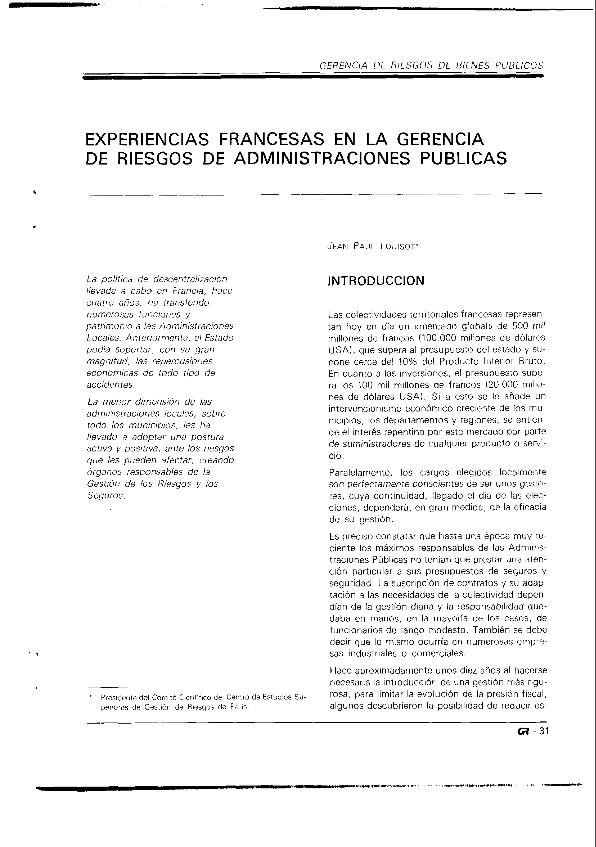 Experiencias francesas en la gerencia de riesgos de administraciones públicas