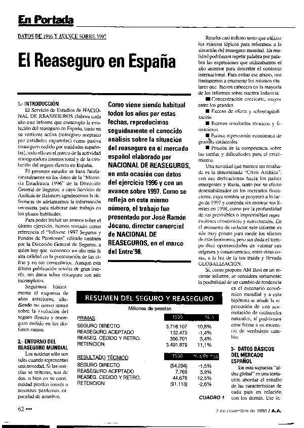 El Reaseguro en España : datos de 1996 y avance sobre 1997