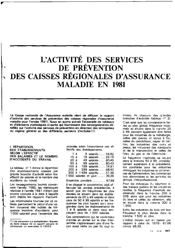 L'Activité des services de prévention des caisses régionales d'assurance maladie en 1981