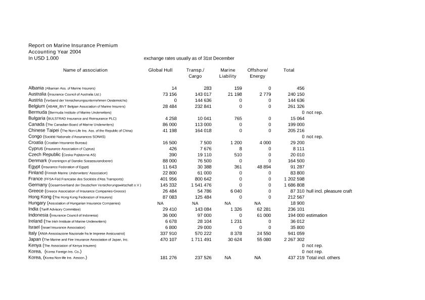 Report on marine insurance premium accounting year [2004-2013, by countries and by regions]