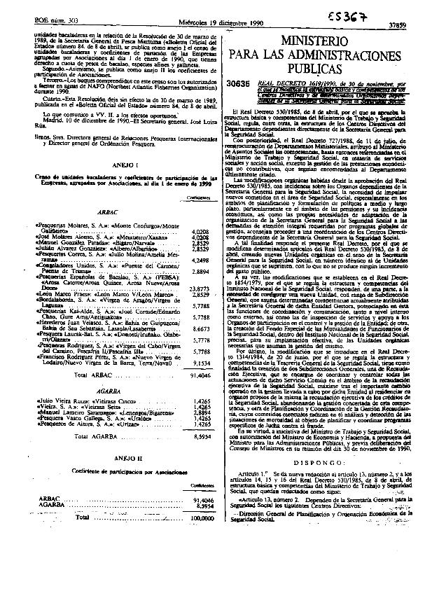 Real Decreto 1619/1990, de 30 de noviembre, por el que se modifica la estructura básica y...