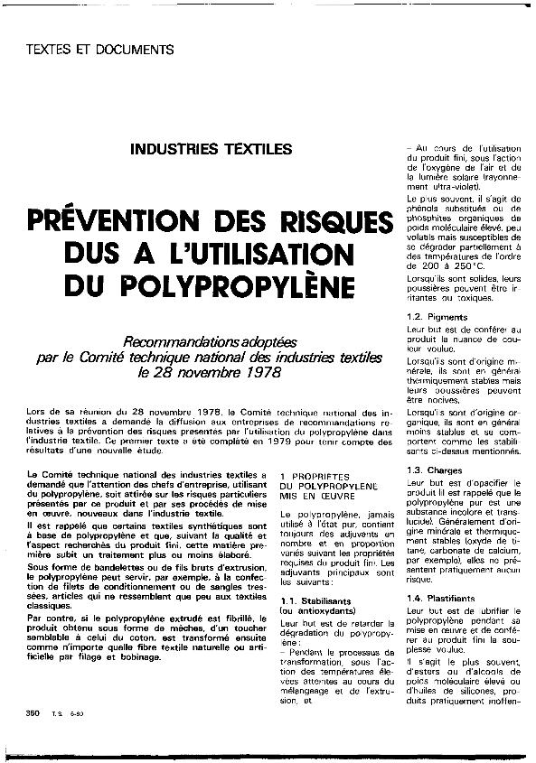 Prévention des risques dus à l'utilisation du polypropylène : recommandations adoptées par le...