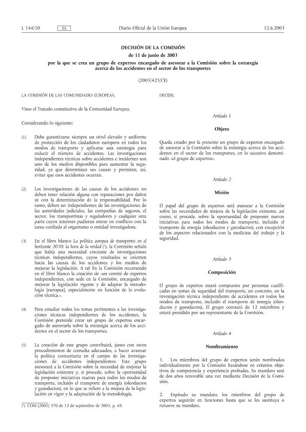 Decisión de la Comisión de 11 de junio de 2003 por la que se crea un grupo de expertos encargado...