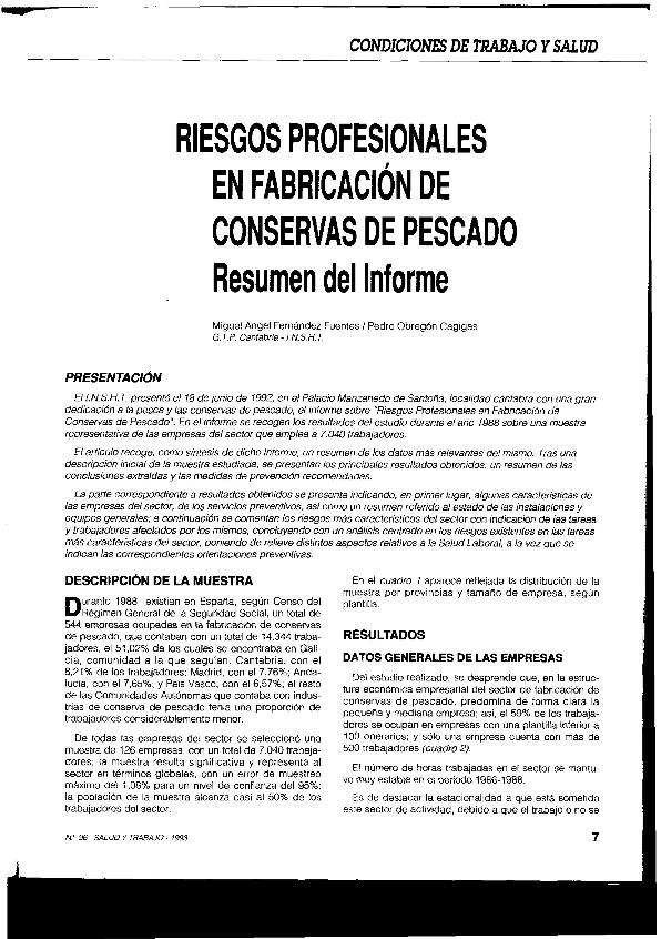 Riesgos profesionales en fabricación de conservas de pescado : resumen del informe