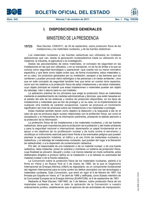 Real Decreto 1308/2011, de 26 de septiembre, sobre protección física de las instalaciones y los...