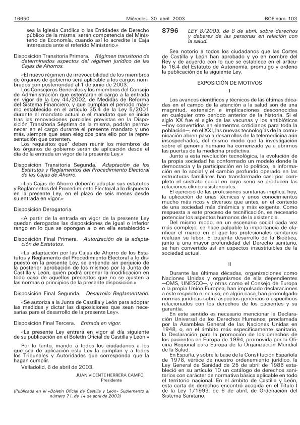 Ley 8/2003, de 8 de abril, sobre derechos y deberes de las personas en relación con la salud