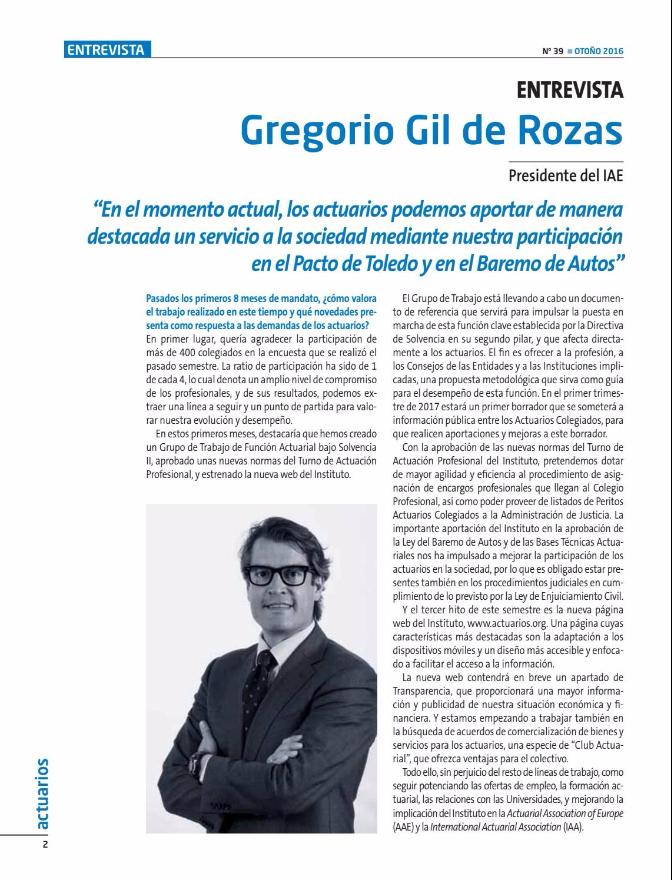 - En: Actuarios. - Madrid : Instituto de Actuarios Españoles, 1990-. - 03/10/2016 Número 39 - otoño 2016 , p. 2-3