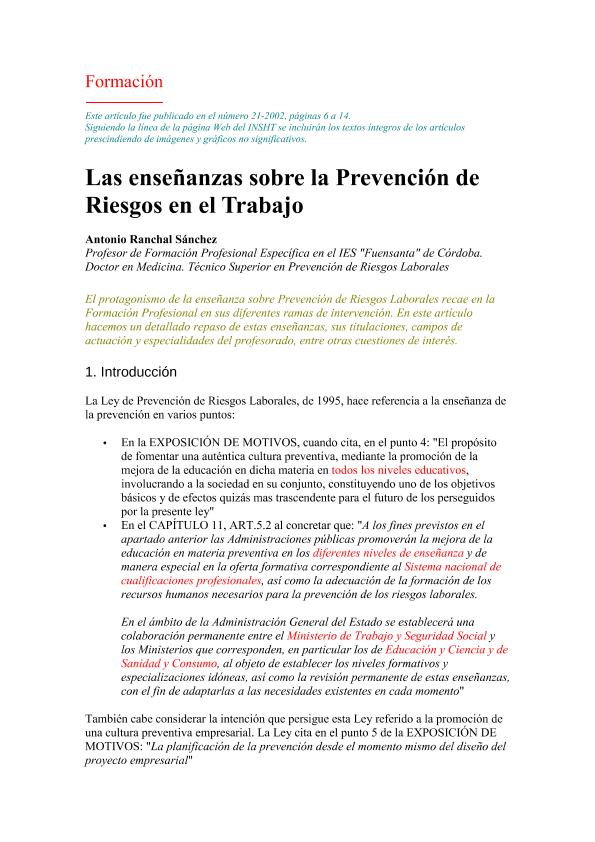 Las Enseñanzas sobre la prevención de Riesgos en el trabajo