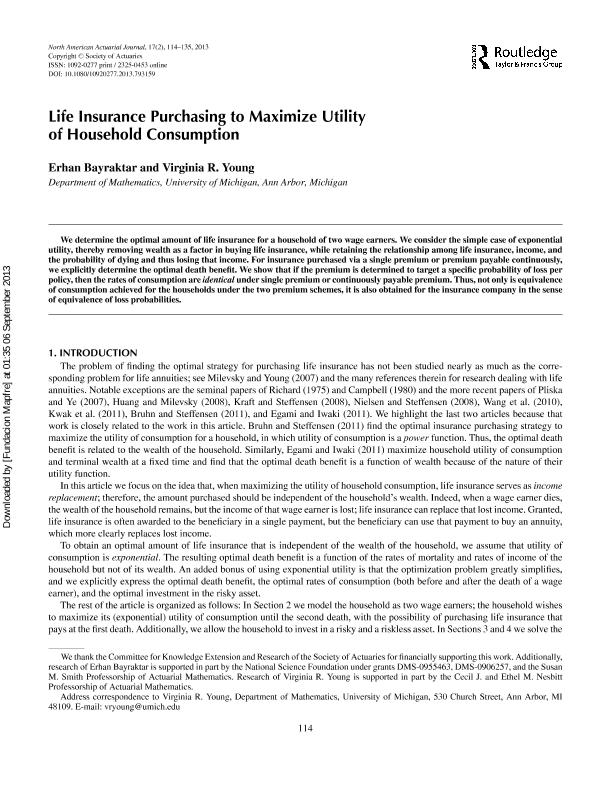 - En: North American actuarial journal. - Schaumburg : Society of Actuaries, 1997- = ISSN 1092-0277. - 01/01/2009 Tomo 13 Número 1 - 2009