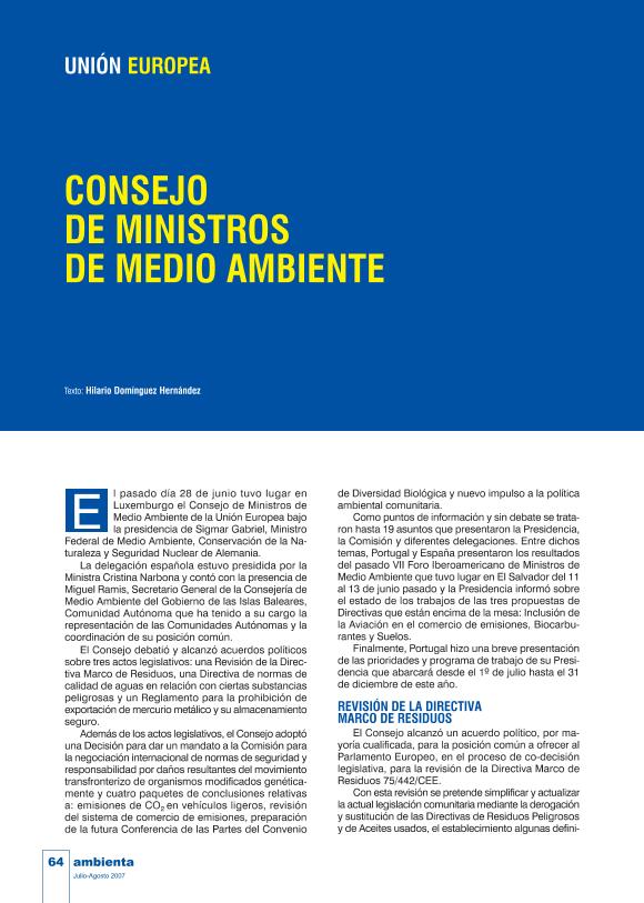 En: Ambienta. - Madrid : Ministerio de Medio Ambiente y Medio Rural y Marino, 2002- = ISSN 1577-9491. - 03/01/2007 Número 64 - Mes Marzo