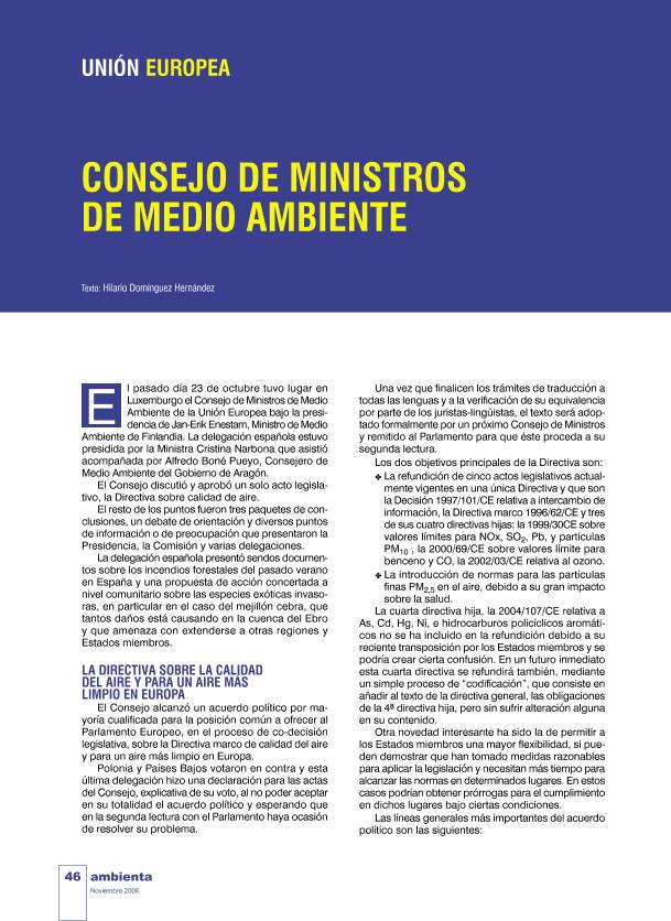En: Ambienta. - Madrid : Ministerio de Medio Ambiente y Medio Rural y Marino, 2002- = ISSN 1577-9491. - 10/01/2006 Número 60 - Mes Noviembre