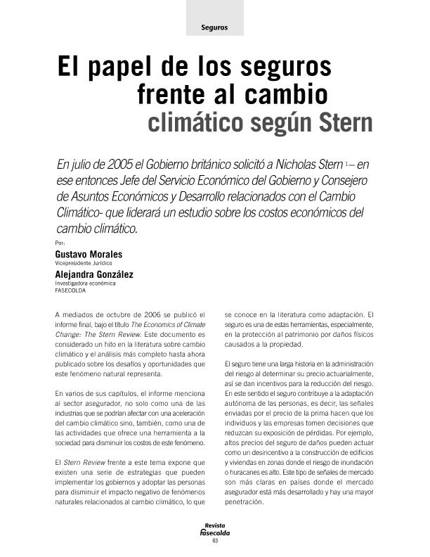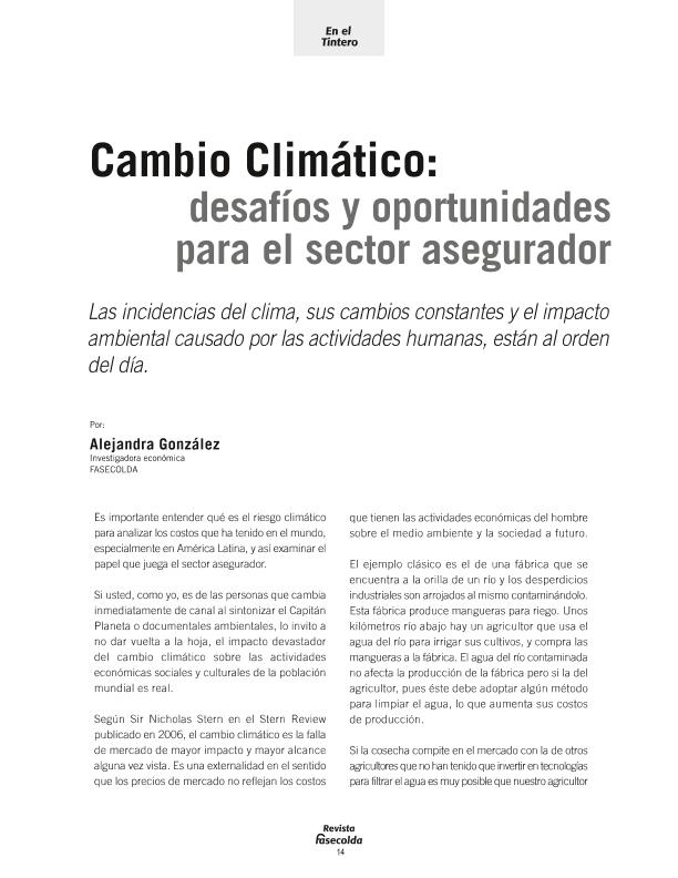 - En: Revista Fasecolda. - Bogotá : Unión de Aseguradoras Colombianos, 1979- = ISSN 0120-1972. - 03/01/2007 Número 122 - 2007 , p. 8-12
