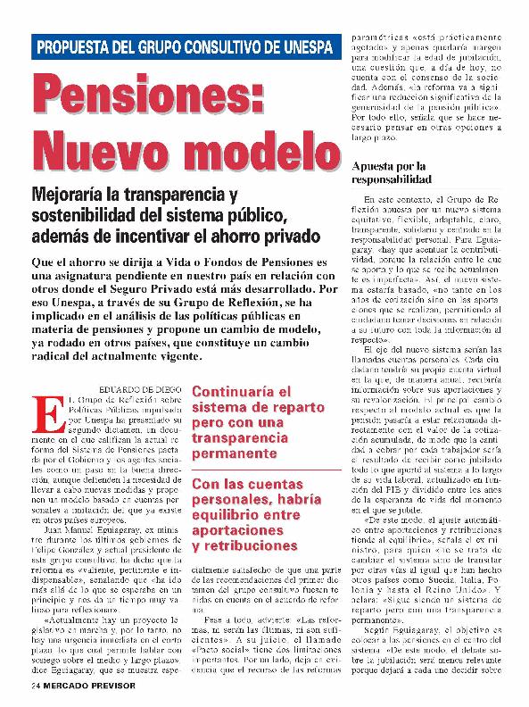 Pensiones : nuevo modelo : propuesta del Grupo Consultivo de UNESPA : mejoraría la transparencia...
