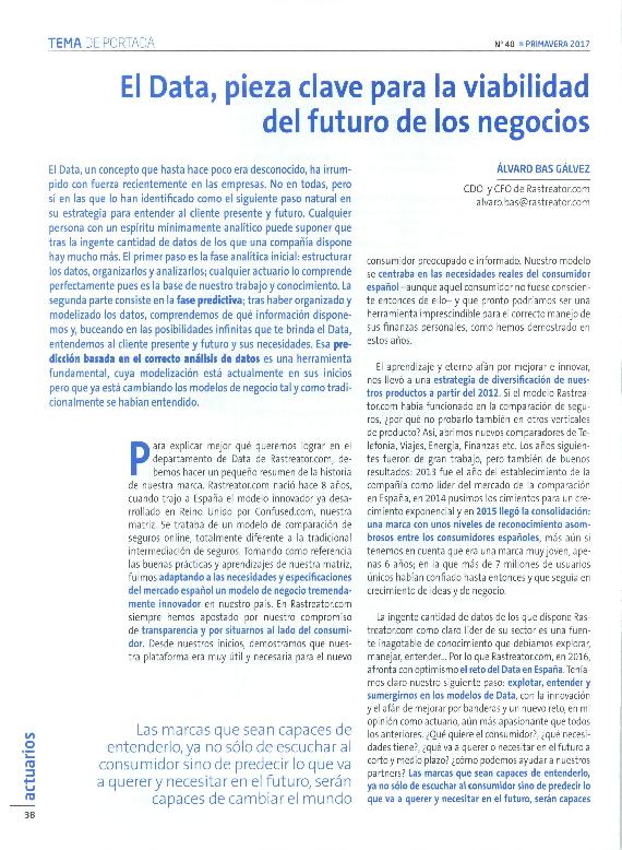 - En: Actuarios. - Madrid : Instituto de Actuarios Españoles, 1990-. - 01/05/2017 Número 40 - mayo 2017 , p. 38-39