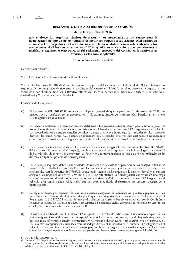 Reglamento Delegado (UE) 2017/79 de la Comisión de 12 de septiembre de 2016 que establece los requisitos técnicos detallados y los procedimientos de ensayo para la homologación de tipo CE de los...