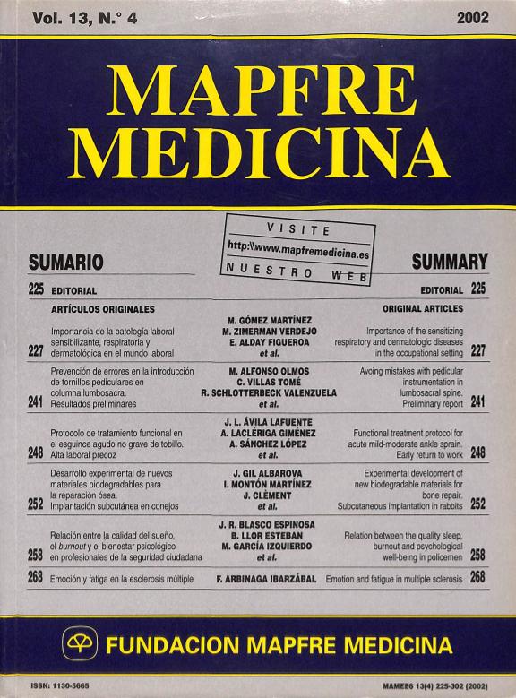 - En: Trauma : (fusión de la revista MAPFRE Medicina y la revista Patología del Aparato Locomotor). - Madrid : FUNDACION MAPFRE, Instituto de Prevención, Salud y Medio Ambiente, 2008-2015 = ISSN 1888-6116. - 01/07/2009 Volumen 20 Número 3 - julio 2009 , p. 151-155