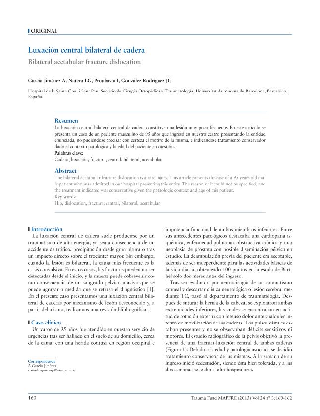 - En: Trauma : (fusión de la revista MAPFRE Medicina y la revista Patología del Aparato Locomotor). - Madrid : FUNDACION MAPFRE, Instituto de Prevención, Salud y Medio Ambiente, 2008-2015 = ISSN 1888-6116. - 01/07/2013 Volumen 24 Número 3 - Julio 2013 , p. 160-162