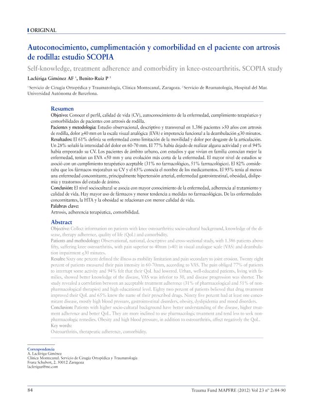 Autoconocimiento, cumplimentación y comorbilidad en el paciente con artrosis de rodilla: estudio...