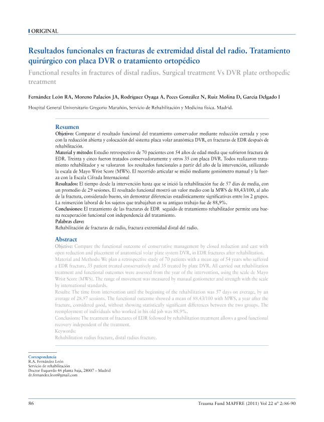 Resultados funcionales en fracturas de extremidad distal del radio. : Tratamiento quirúrgico con...