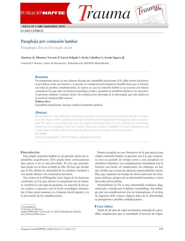 - En: Trauma : (fusión de la revista MAPFRE Medicina y la revista Patología del Aparato Locomotor). - Madrid : FUNDACION MAPFRE, Instituto de Prevención, Salud y Medio Ambiente, 2008-2015 = ISSN 1888-6116. - 01/07/2010 Volumen 21 Número 3 - julio 2010 , p. 169-173