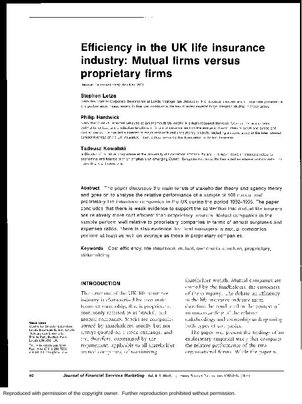 Efficiency in the UK life insurance industry : mutual firms versus proprietary firms