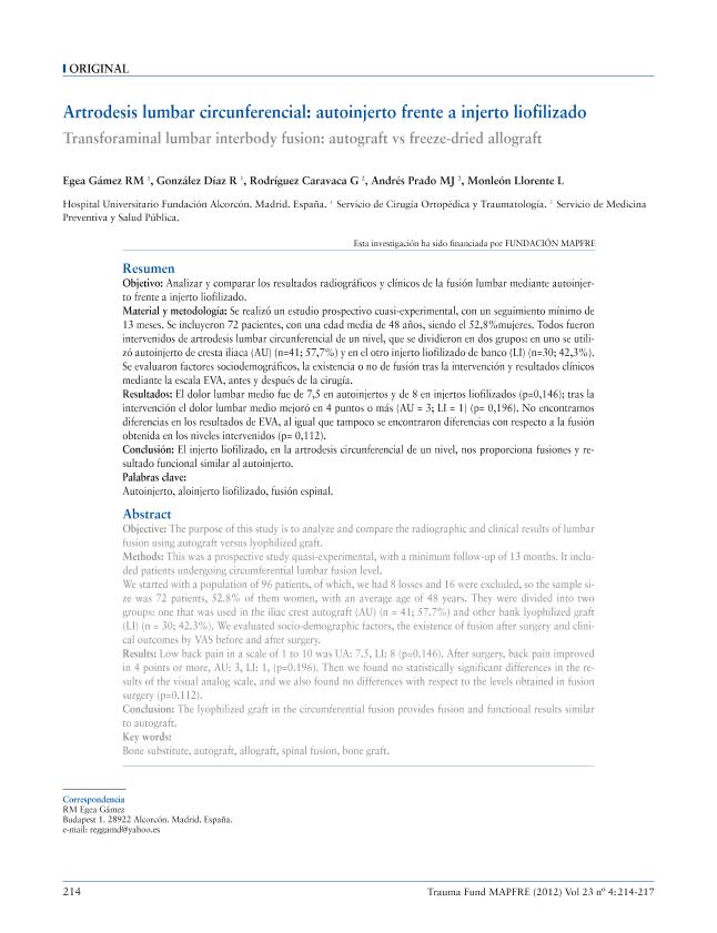 Artrodesis lumbar circunferencial: autoinjerto frente a injerto liofilizado