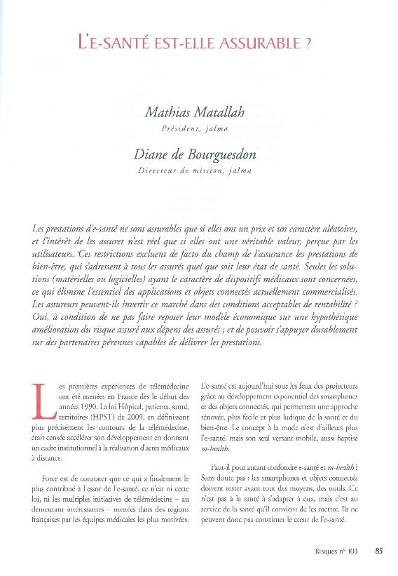 En: Risques : les cahiers de l'assurance. - Paris : FFSA, 1990- = ISSN 1152-9253. - 07/09/2015 Número 103 - septiembre 2015 , p. 85-89