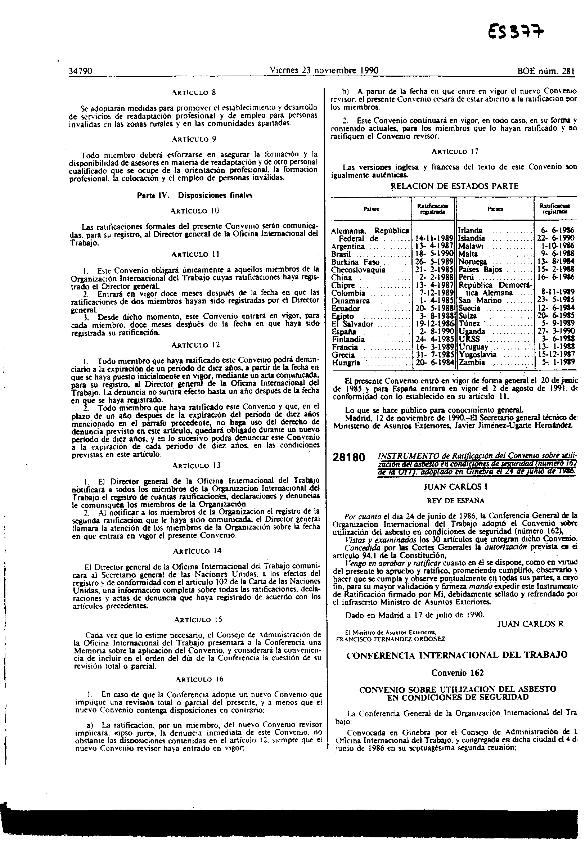 Convenio de la O.I.T. 20 junio 1977, núm. 148, ratificado por instrumento 24 noviembre 1980....
