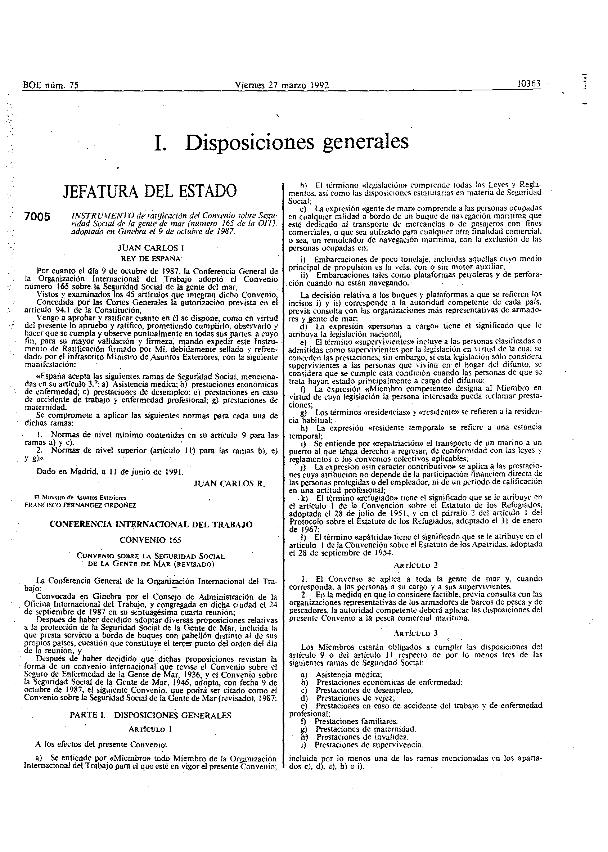 Convenio de la OIT 9 octubre 1987, núm. 165, ratificado por instrumento 11 junio 1991. Marina...