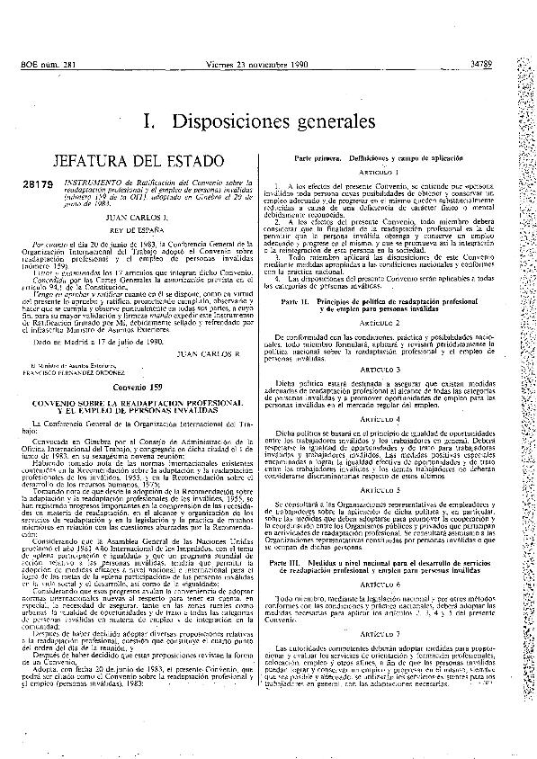Convenio de la OIT 20 junio 1983, núm. 159, ratificado por instrumento 17 julio 1990. Inválidos...
