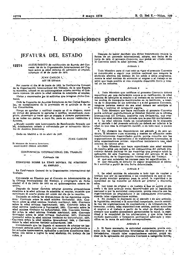 Convenio de la O.I.T. 26 junio 1973, núm. 138, ratificado por instrumento 13 abril 1977. Trabajo...