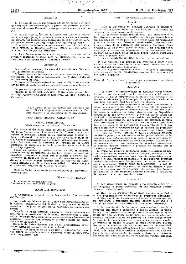 Convenio 25 junio 1963, núm. 119, ratificado por Instrumento 26 noviembre 1971. Máquinas. Protección