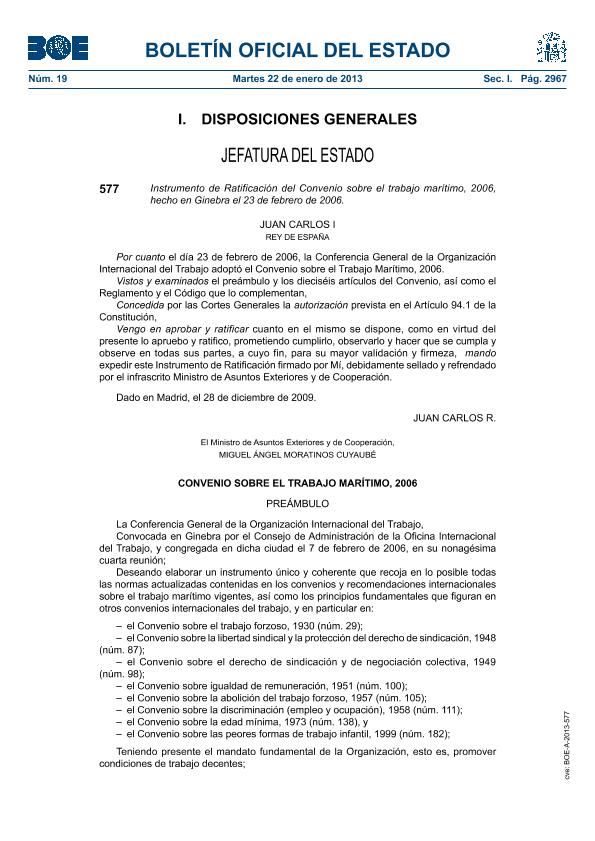 Instrumento de Ratificación del Convenio sobre el trabajo marítimo, 2006, hecho en Ginebra el 23...