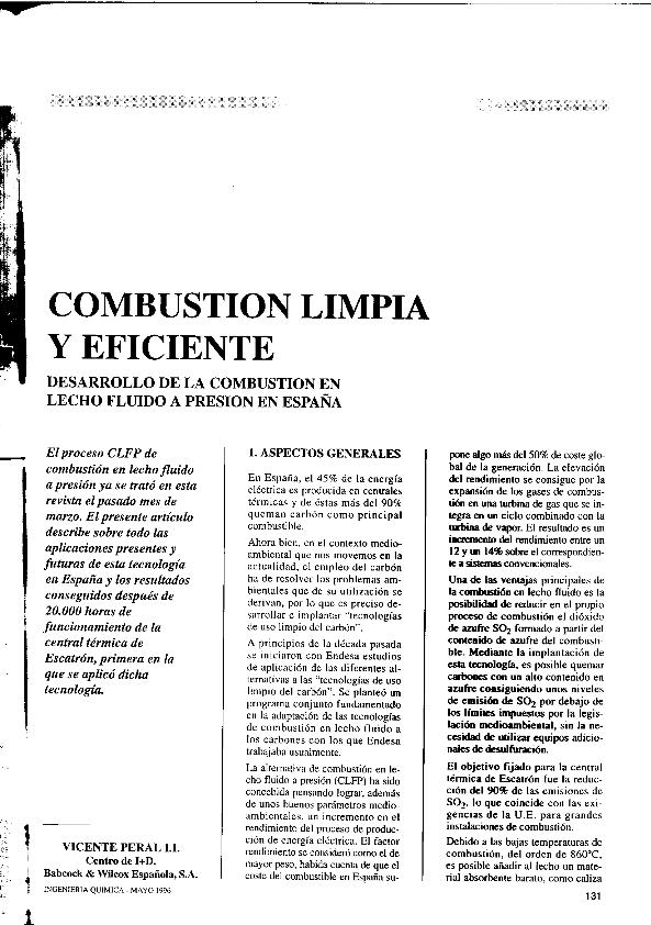 Combustión limpia y eficiente : desarrollo de la combustión en lecho fluido a presión en España
