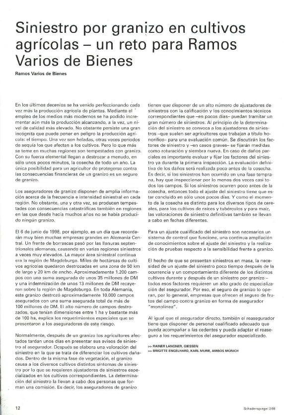 En: Schaden Spiegel : boletín de siniestros. - Munich : Münchener Rück, Munich Re Group, 1977-2011 = ISSN 0941-6595. - 01/01/1999 Año 42, nº 2 1999, p. 12-13