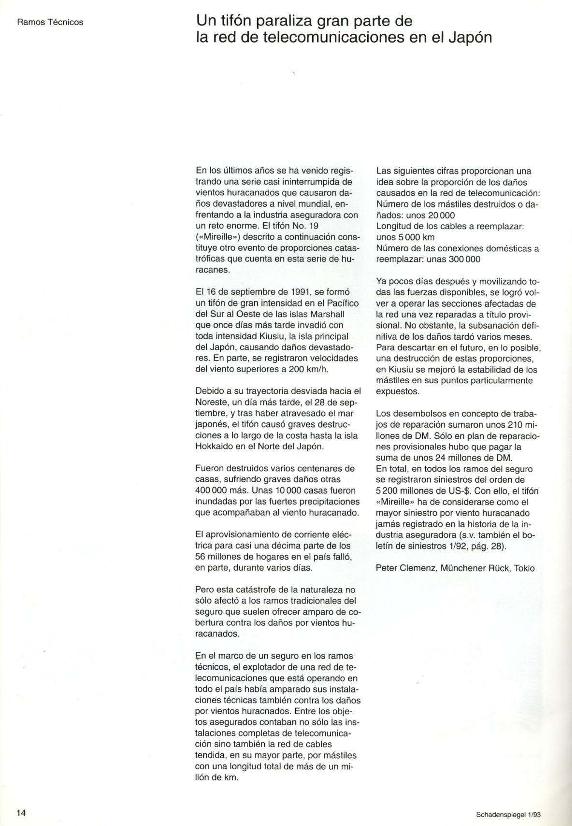 En: Schaden Spiegel : boletín de siniestros. - Munich : Münchener Rück, Munich Re Group, 1977-2011 = ISSN 0941-6595. - 01/06/1993 Tomo 1 Número 1 - 1993, p. 14-15