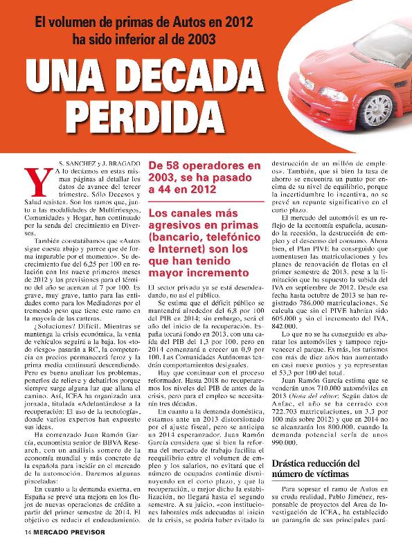 Una Década perdida : el volumen de primas de Autos en 2012 ha sido inferior al de 2003 y la...