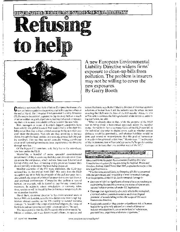 Section: Articles Title: Refusing to help / by Garry BoothAuthor: Booth, Garry Notes: A new European Environmental Liability Directive widens firms'exposure to clean-up bills from pollution. The problem is insurers may not be willing to cover the new exposuresRelated records: En: Reactions. - London. - Vol. 27, Issue 3, April 2007 ; p. 14-16Materia / lugar / evento: Seguro de responsabilidad civil por daños al medio ambiente Normativa comunitaria Derecho de seguros Unión Europea Secondary titles: Título: ReactionsOther categories: 334 Rights: In Copyright (InC)