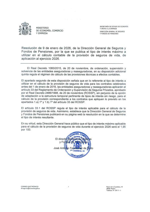Resolución de 9 de enero de 2026, de la Direccion General de Seguros y Fondos de Pensiones, por la que se publica el tipo de interés maximo a utilizar en el calculo contable de la provisión de seguros de vida, de aplicacion al ejercicio 2026