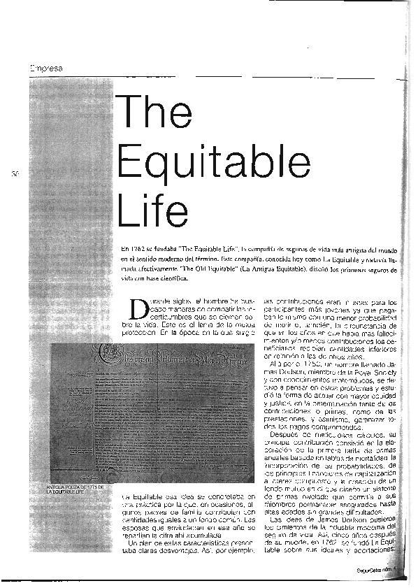 Publicación: . : .Notas: Sumario: "The Equitable Life", compañía de seguros de vida más antigua del mundo en el sentido moderno del término. Esta compañía, conocida hoy como "La Equitable" y todavía llamada afectivamente "The Old Equitable", diseñó los primeros seguros de vida con base científicaRegistros relacionados: En: Revista SegurCaixa. - [Barcelona] : SegurCaixa, [19--?]. - núm. 4 ; 7 p.Materia / lugar / evento: The Equitable Life Historia del seguro Empresas de seguros Seguro de vida España Otras clasificaciones: 14
