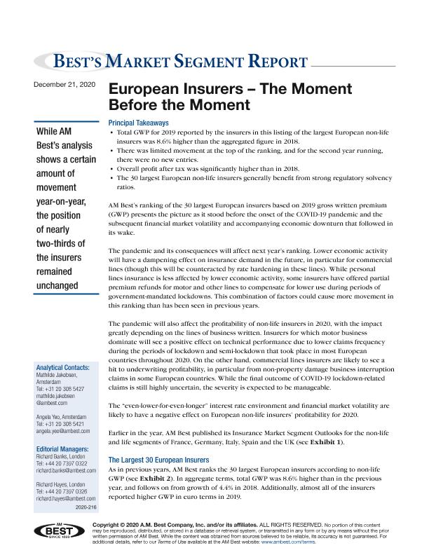 Serie secundaria: Best's Market Segment Report ; December 21, 2020 Otras clasificaciones: 219