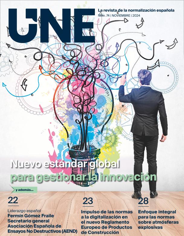 Sección: Artículos Título: UNE : La revista de la normalización española. nº 74, noviembre 2024 Notas: Sumario: Normalización en acción. Servicios de seguridad privada CTN-UNE 196/SC 5 - Nuevo estándar global para gestionar la innovación - Liderazgo internacional europeo de la normalización española: [entrevista a] Fermín Gómez Fraile, secretario general Asociación Española de Ensayos no Destructivos (AEND) - Impulso de las normas a la digitalización en el nuevo Reglamento Europeo de productos de construcción - Enfoque integral para las normas sobre atmósferas explosivasRegistros relacionados: En: UNE: La revista de la normalización española. - Madrid : Asociación españla de normalizacion, UNE, 2018-. - 04/11/2024 Número 74 - noviembre 2024 , 32 p.Materia / lugar / evento: Normalización Normas UNE Liderazgo Digitalización Innovación Construcción España Otras clasificaciones: 938 Derechos: In Copyright (InC) Ver detalle del número