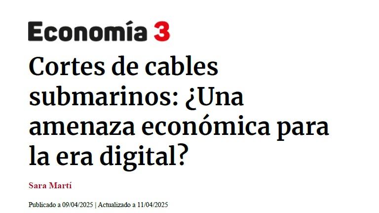 Sección: ArtículosTítulo: Cortes de cables submarinos: ¿una amenaza económica para la era digital? / Sara MartíAutor: Martí, Sara Notas: Sumario: Los cables submarinos de fibra óptica son la infraestructura crítica central de la era digital. Las líneas trazadas por estos cables no solo revelan cómo se mueve la información de un punto a otro sino que construyen un mapa indicador de los flujos de poder económico entre los distintos continentes. Estas grandes infraestructuras transportan el 98% del tráfico de internet. Accidentales o intencionados, lo cierto es que al año se registran en todo el lecho marino mundial entre 150 y 200 cortes de cables de datos, según Naciones UnidasContiene: Cortes de cables submarinos: origen -- Una extensa red mundial -- La amenaza 'fantasma' -- Impacto global de los cortes de cables submarinosRegistros relacionados: En: Newsletter Economia3.- Valencia : E3 Media, 2025. - 11 de abril de 2025Materia / lugar / evento: Gerencia de riesgosInfraestructuras críticasCables eléctricosObras marítimasTelecomunicacionesAccidentes marítimosImpacto económicoRedes de comunicacionesVulnerabilidadSociedad digitalOtras clasificaciones: 7Derechos: In Copyright (InC)Referencias externas: